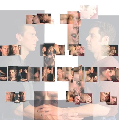 The pieces on this page are composed of images of scenarios staged for the camera using actors. They explore contradictory motivations in troubled relationships between gay men, relationships in which extreme emotions and sexual urges override rationality and self-control. Non-linear narrative and compositional structures provide a more complex and “true” description of the interaction. The scenes were photographed with conventional film, and the resulting images were then digitally manipulated and combined. The final works are output as direct digital prints (digital C or inkjet), or as digitally-recorded, large-format transparencies from which conventional photo prints are made.